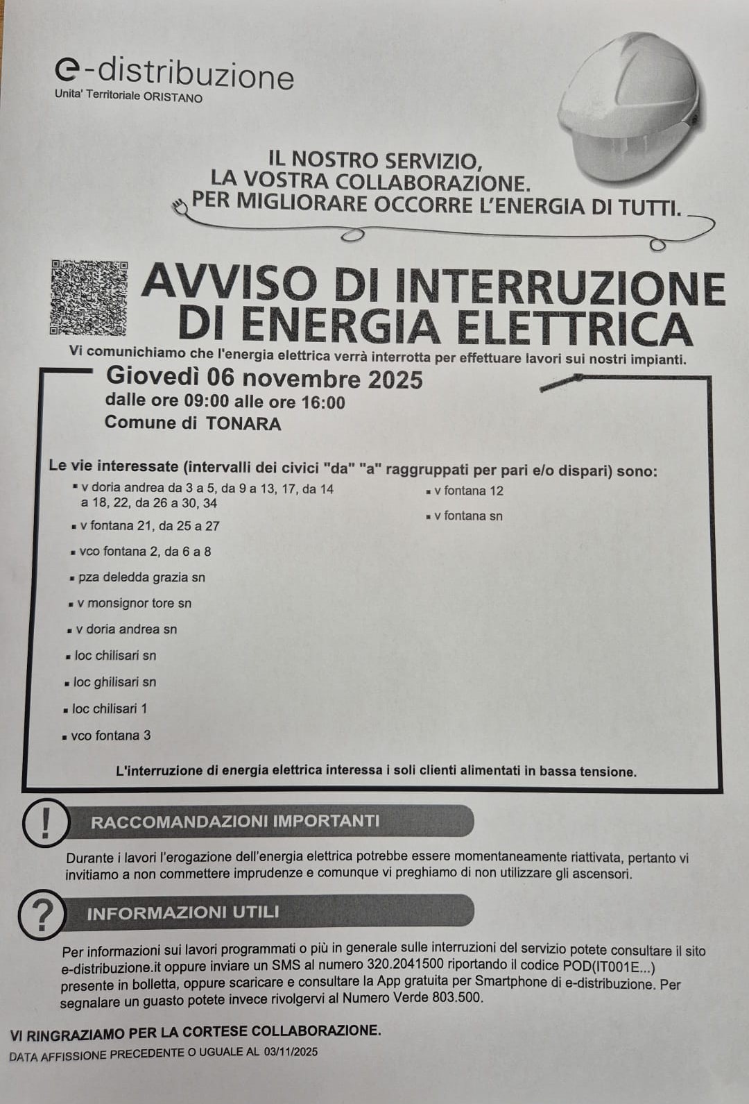 Si comunicano possibil idisservizi Enel per l'erogazione dell'energia elettrica in varie vie dell'abitato di Tonara come da avviso allegato. L'interruzione nell'erogazione è prevista per giovedì 06.11.2025 dalle ore 09.00 alle ore 16.00